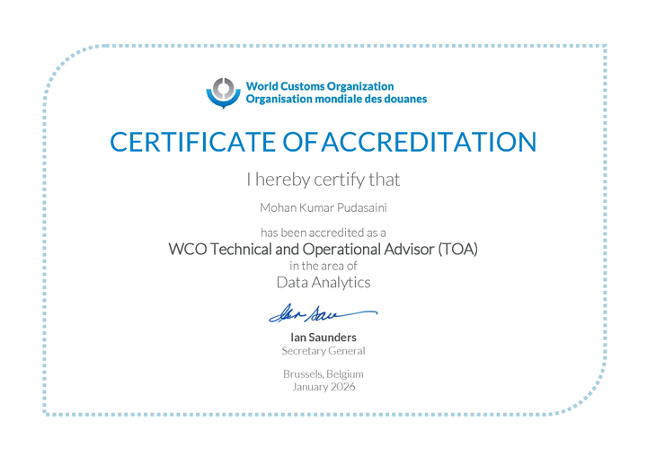 I am honored to share that I have recently been accredited by the World Customs Organization (WCO) as a Technical and Operational Advisor in the area of Data Analytics. This marks my second accreditation from the WCO, following my earlier recognition as an expert in Risk Management.